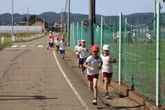 スタートの合図とともに、元気よく走り出した1・2年生です。1・2年生のチャレンジコースは800mです。グラウンドを約1周走った後、学校の周りのコースを2周しました。途中、富岡保育園の園児さんからも「がんばれ~」と元気いっぱいの応援をもらいました。