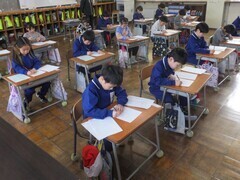 1月9日、校内書初め会を行いました。1.2年生は硬筆、3年生以上は毛筆です。2学期や冬休みに練習してきた成果を発揮しようと、お手本をよく見ながら、文字の形や大きさに加えて、「とめ」「はね」「はらい」といった細かなところまで注意しながら、心を込めて書いていました。
