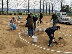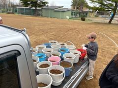 4月9日にPTA奉仕作業を行いました。作業は、毎年この時期に実施しているグラウンドの砂取りです。スコップで砂を集め、バケツに入れて運び出しました。取った砂は、中庭の雨水がたまってしまう低い場所の補修に活用しました。作業は、保護者・子ども・職員の総勢約35名で1時間弱行いました。5月には富岡スポーツフェスティバルもありますが、今回の砂取り作業で走りやすいグラウンドになりました。ご参加いただいた皆様、大変ありがとうございました。