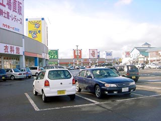 広い駐車場があり、週末にはたくさんの車がとまっています。買った品物をワゴンにのせて車まで運んでいる人もいます。